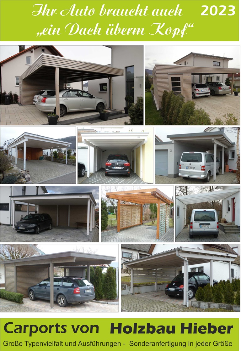 Im Katalog finden Sie die verschiedensten Ausführungen einschl. Preisliste. Gerne machen wir Ihnen ein unverbindliches Angebot für einen Carport nach Ihren Vorstellungen. Auch sind wir behilflich wenn es darum geht ein Baugesuch für den Carport zu erstellen.